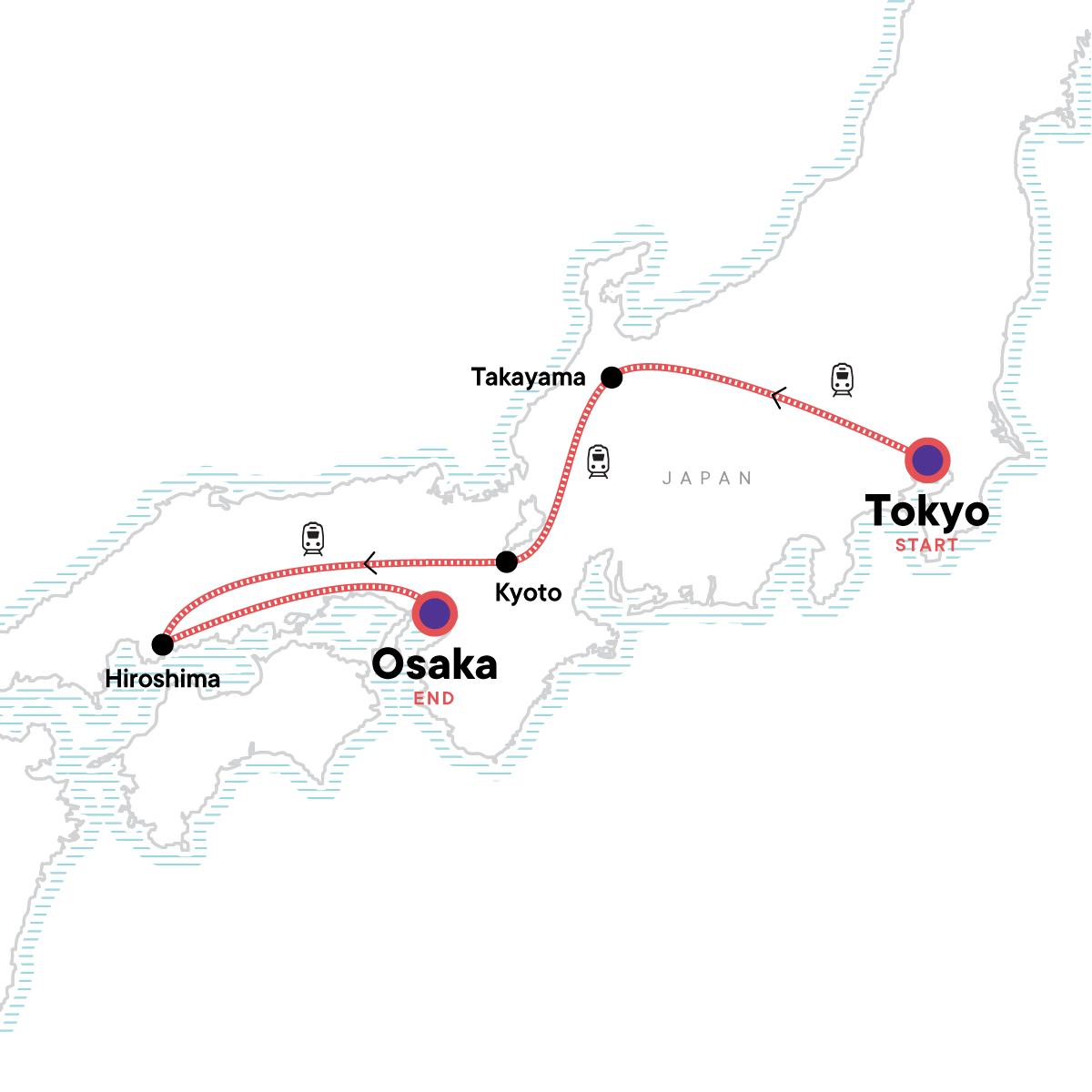 Your Big Night Out Moment: Osaka. Orientation walks in Tokyo and Takayama. Overnight stay in a traditional inn. Miyajima Island visit. Free time in each destination. Japan Rail (JR) pass (7 days). All transport between destinations and to/from included activities.