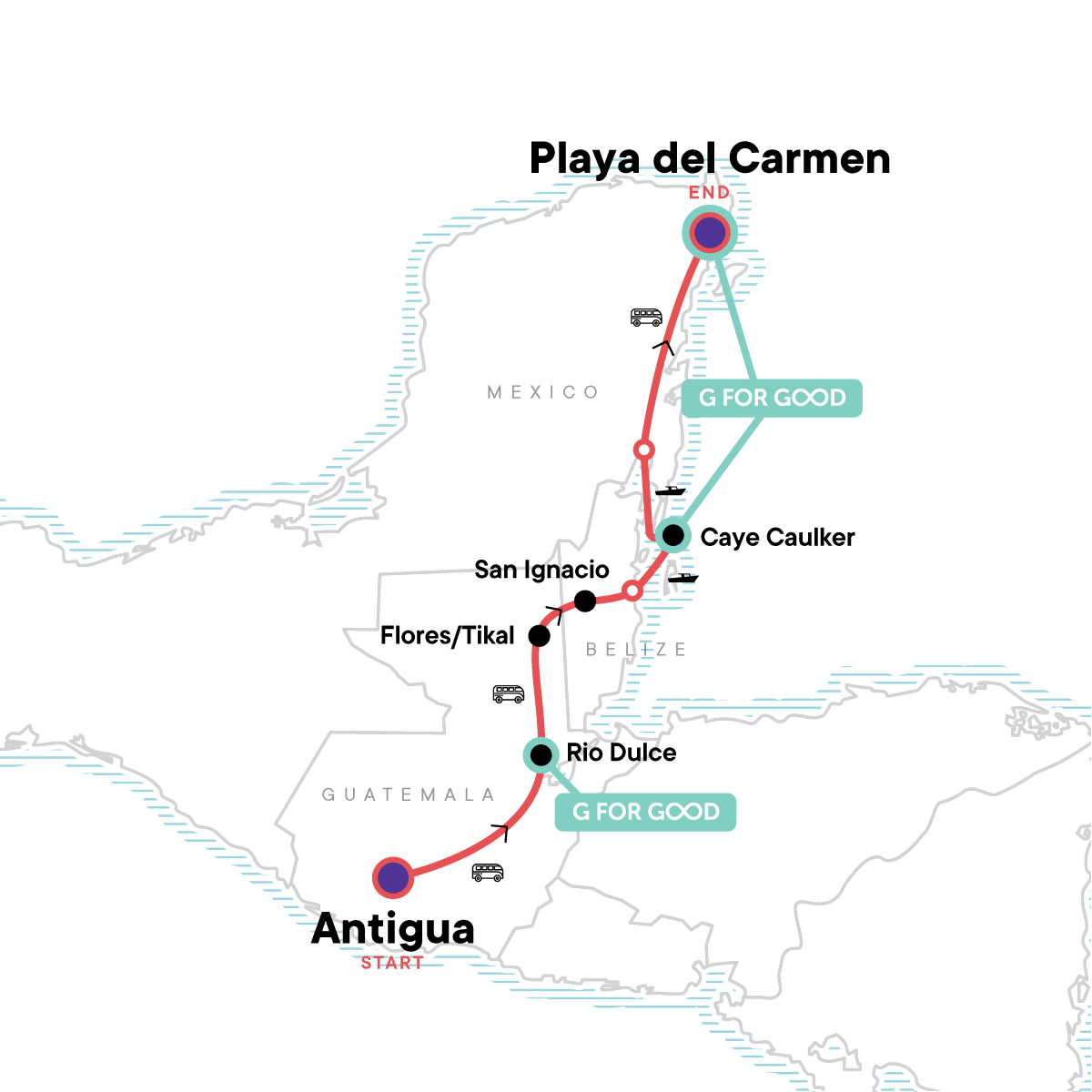 Your Discover Moment: Playa del Carmen. Scenic boat ride to Livingston. Tikal guided tour. Free time in San Ignacio, Caye Caulker, and Playa del Carmen. All transport between destinations and to/from included activities.