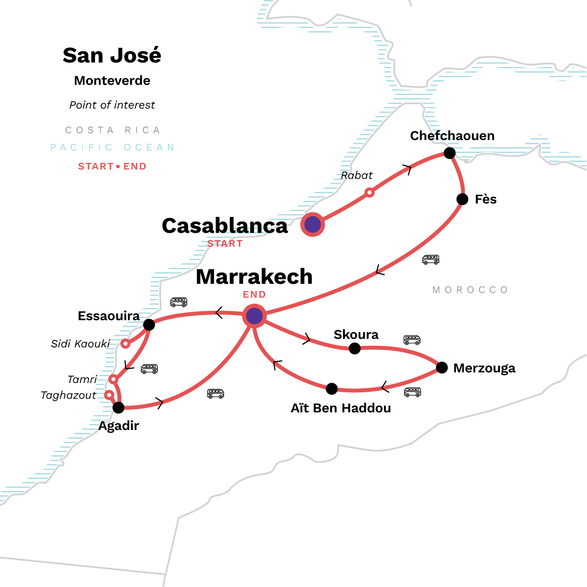 Your Big Night Out Moment: Marrakech. Enjoy free time in Rabat. Explore the blue city of Chefchaouen. Visit the medina and souks of Fès. Dades Gorge walk. Sand boarding in the desert dunes. Guided medina visit in Marrakech. Sunset camel ride in the desert. Traditional dinner and drums under the stars. Aït Ben Haddou Kasbah tour. Surf lesson in Taghazout. Sunset beach bonfire. Essaouira orientation walk. All transport between destinations and to/from included activities.
