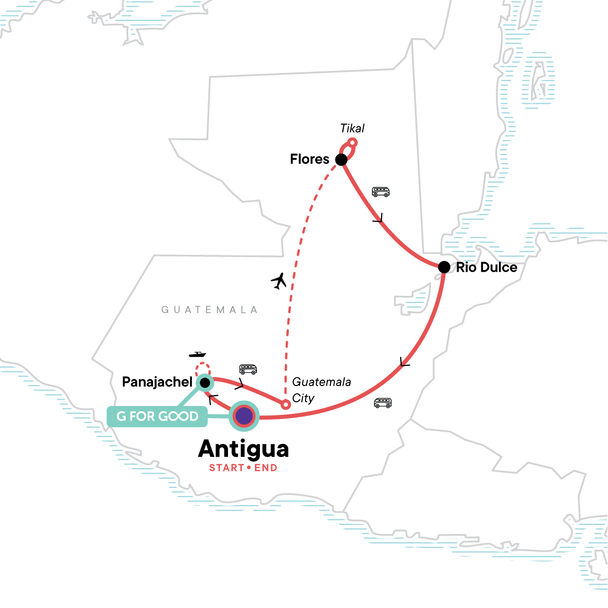 Me Day: Rio Dulce Me Day, Rio Dulce. Complimentary arrival transfer. CEO-led walking tour of Antigua. Boat tour of Lake Atitlan. Tikal Tour with a local guide. Visit to Finca Paraíso. Free time in Antigua, Panajachel, Flores, and Rio Dulce. Internal flight between Guatemala City & Flores. All transport between destinations and to/from included activities.