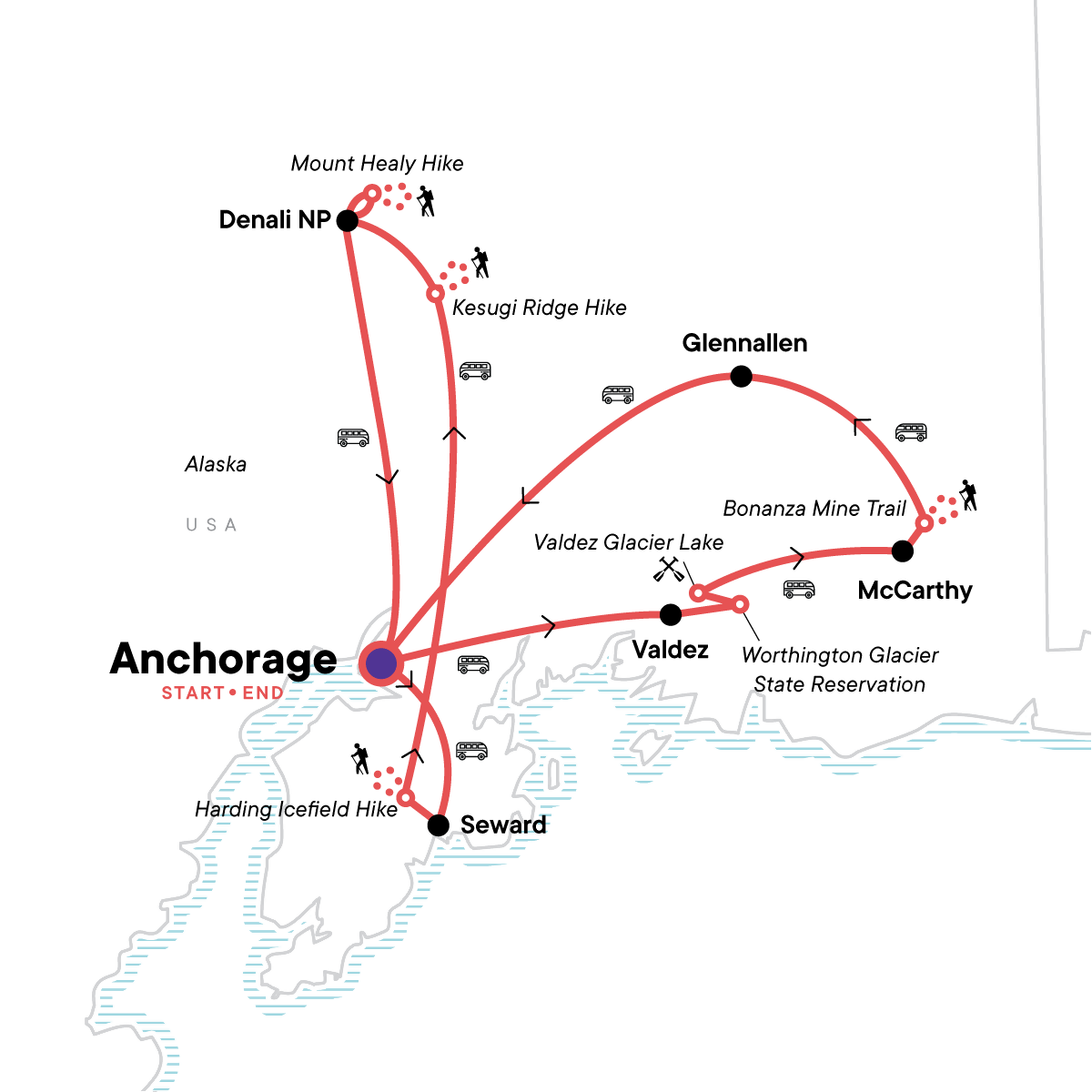 Your Welcome Moment: Meet Your CEO and Group. A visit to Churgach National Forest. A hike up Mount Marathon in Seward. Harding Icefield Hike. Talkeetna Lake Trail hike. A hike up the Mount Healy Overlook trail. Hike along Horseshoe Lake. Visit to Matanuska Recreation Site. Worthington Glacier hike. Glacier Lake guided hiking and kayaking trip. Wrangell-St Elias National Park visit. Bonanza Mine trail hike. Copper Visitor Center trip. National Park entrance fees. All transport between destination and to/from included activities.
