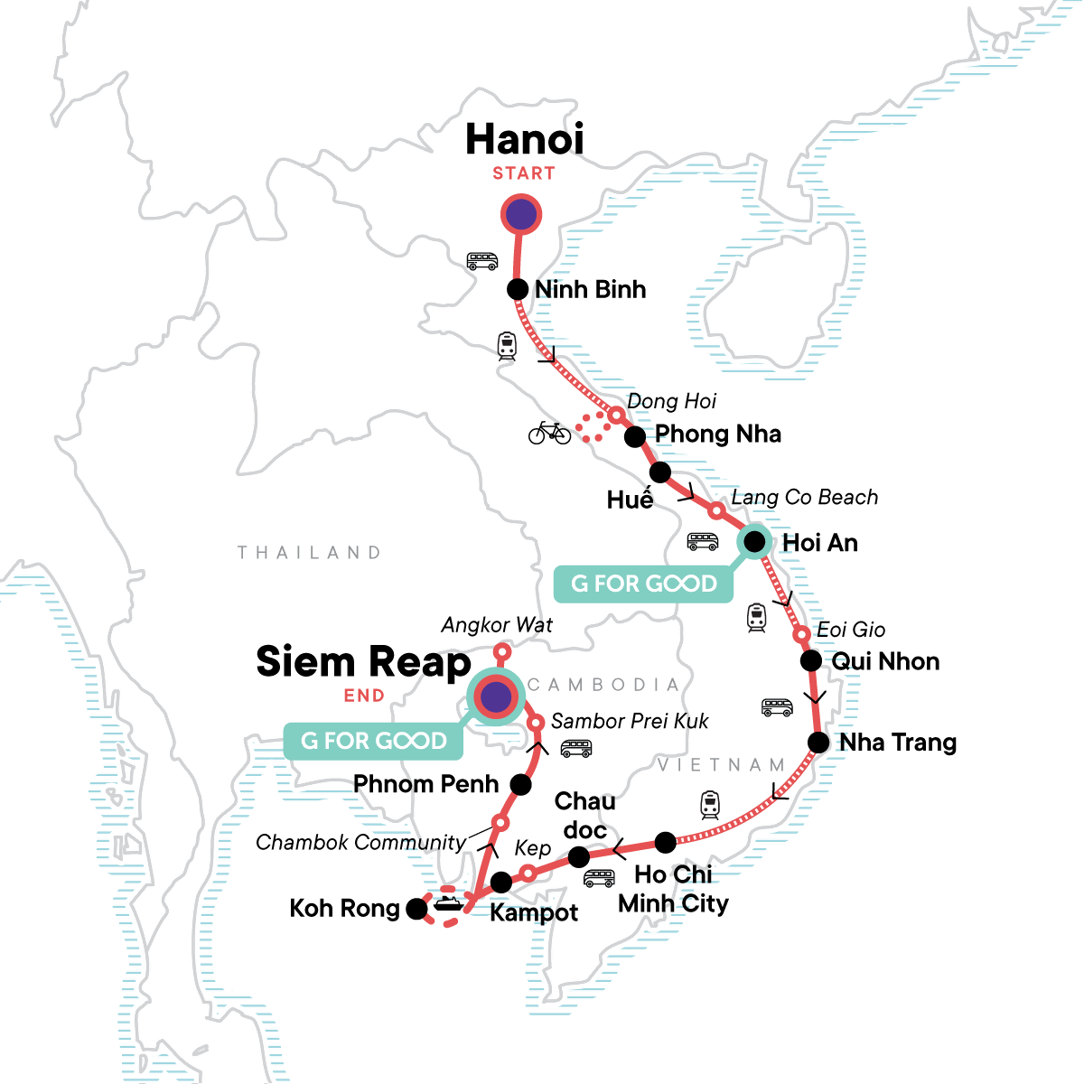 Enjoy time to see all sides of the magical city of Hanoi, Sample Oodles of Noodles in Hoi An and Beers in Hanoi, See it sights of Phnom Penh on an epic cyclo-tour, Swim in crystal clear water and enjoy a beer on the beach in Qui Nhon and Koh Rong island, Descend into the remote Vinh Moc Tunnels, Explore the Mekong Delta Hang Cave Pagoda by motorbike and floating markets of by boat